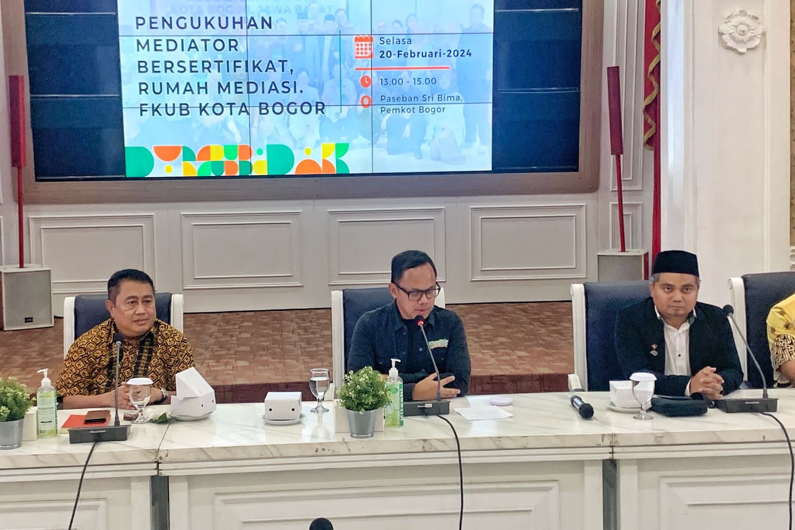 BOGOR, DINAMIKA NEWS — Sebanyak 27 mediator dikukuhkan Wali Kota Bogor, Bima Arya dan Wakil Wali Kota Bogor, Dedie A. Rachim di Paseban Sri Bima, Balai Kota Bogor, Selasa (20/2/2024).
