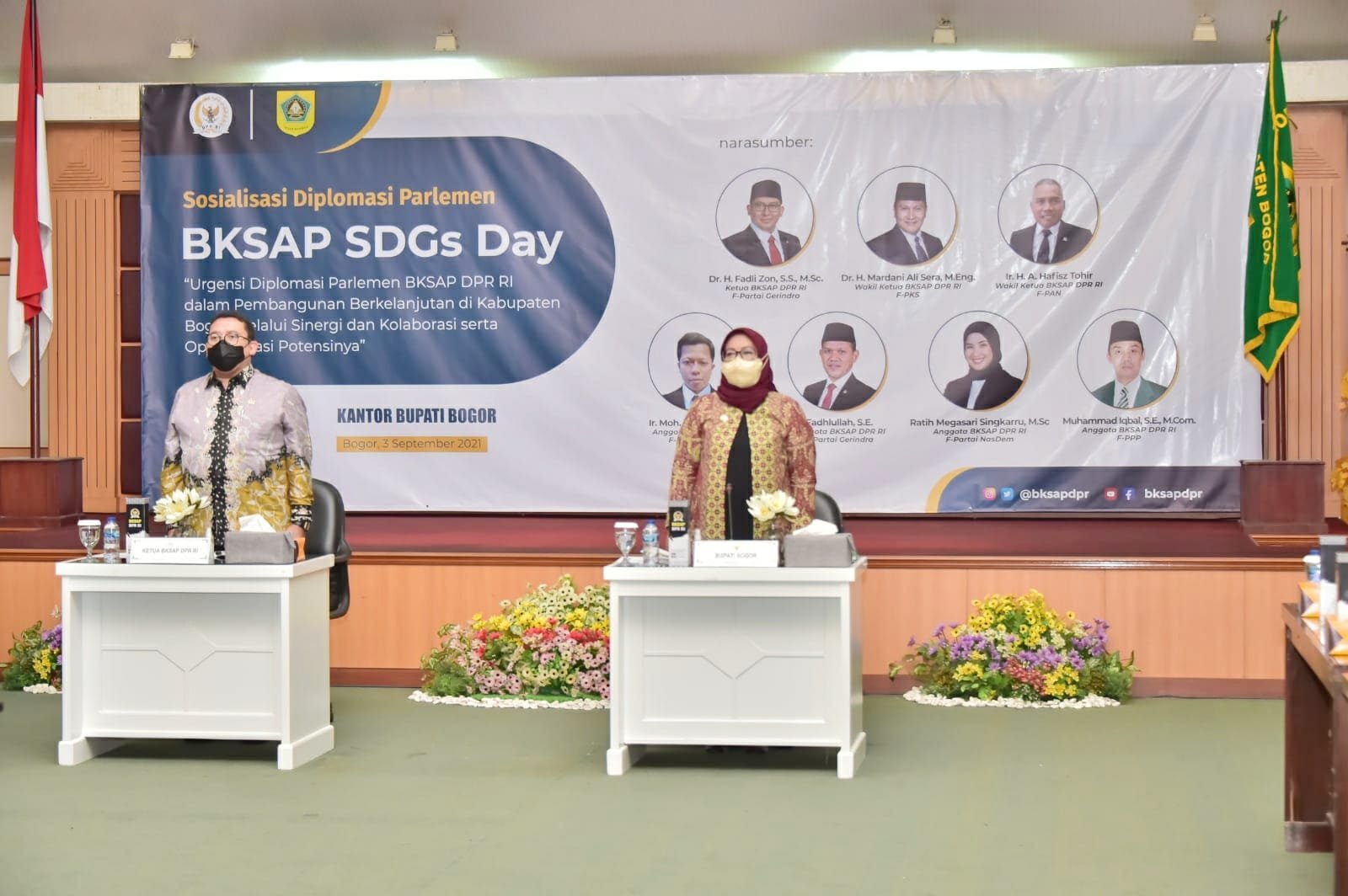 Bupati Bogor Ade Yasin menerangkan, berdasarkan kesepakatan internasional terkait pencapaian Tujuan Pembangunan Berkelanjutan hingga tahun 2030 dan diperkuat oleh Peraturan Presiden Republik Indonesia Nomor 59 Tahun 2017 Tentang Pelaksanaan Pencapaian Tujuan Pembangunan Berkelanjutan, komitmen pemerintah daerah untuk mewujudkan 17 SDG’s tertuang dalam Perda Nomor 4/2019 tentang RPJMD dan perubahan RPJMD 2018-2023. Pada dasarnya berbagai indikator capaian kinerja pemerintah daerah yang menjadi urusan wajib pelayanan dasar, wajib non pelayanan dasar maupun pilihan tentunya beririsan dengan tujuan pembangunan berkelanjutan.