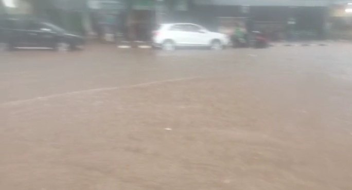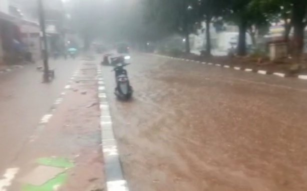 | Akibat saluran drainase kurang baik, jalan Ediyoso Martadipura menuju Stadion Pakansari terjadi banjir parah. |
