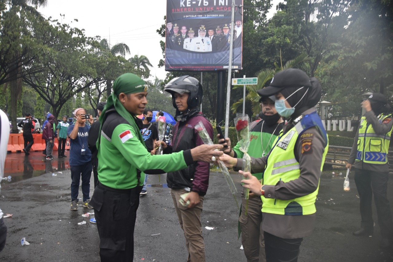 Regu Polwan yang diterjunkan dalam pengamanan aksi ini, turut menyejukkan para demonstran dengan membagi-bagikan bunga di tengah aksinya.