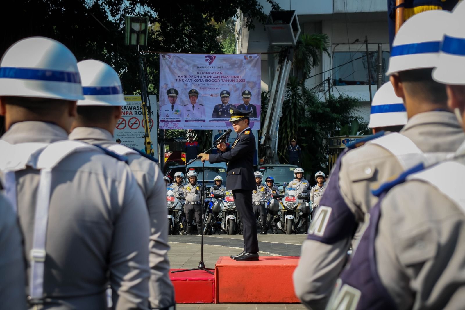 BOGOR, DINAMIKA NEWS — Apel besar Hari Perhubungan Nasional Tingkat Kota Bogor (Harhubnas) Tahun 2023. Inspektur upacara (Irup) Wali Kota Bogor Bima Arya, Kamis (21/9/2023) di Plaza Balaikota Bogor.