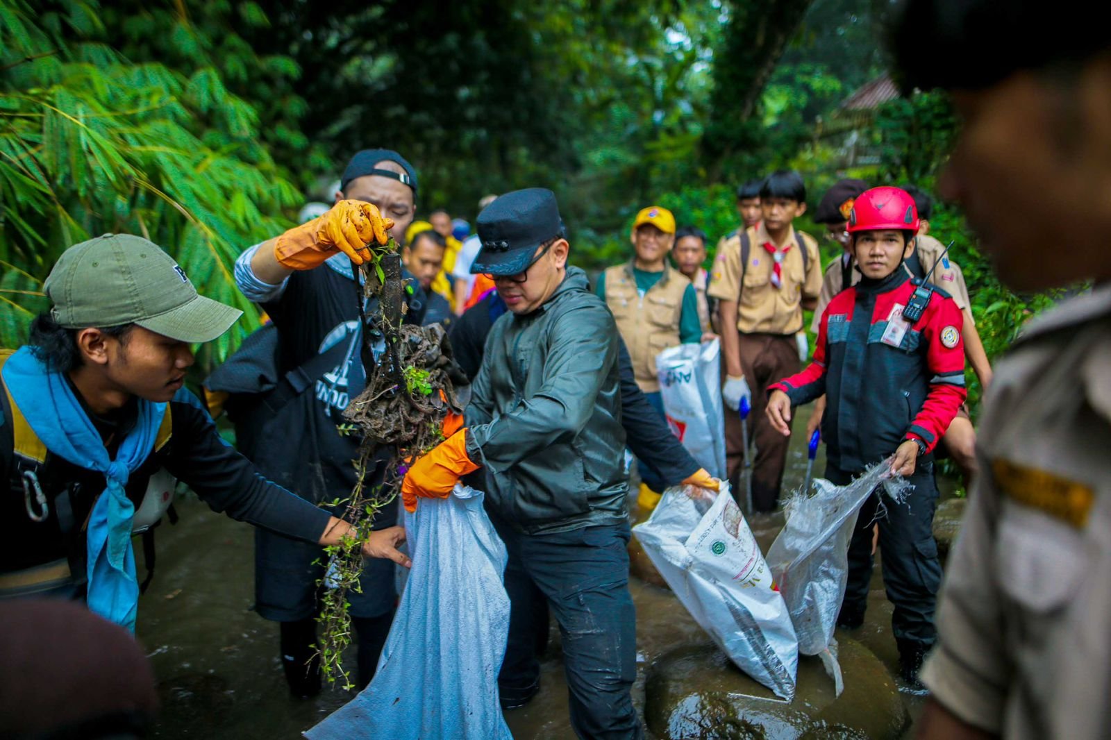 Kondisi cuaca yang mendung dan gerimis tidak menyurutkan semangat para peserta yang melakukan bersih-bersih anak sungai di Kebun Raya Bogor.