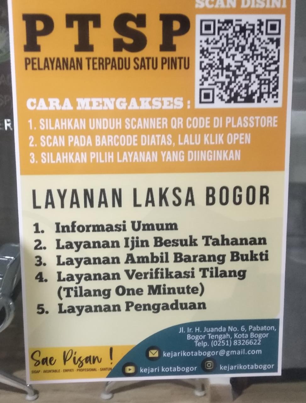 “PTSP Laksa yakni Layanan Komplik Sadayana Kejaksaan Negeri Kota Bogor, diresmikan pak Kajati dalam Kunjungan kerja (Kungker) ke Kota Bogor,” kata Kajari Sekti Anggraini pada wartawan Selasa (12/10/2021) siang.