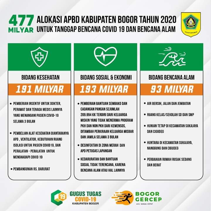 “Kebijakan ini diambil agar wabah corona bisa segera di kendalikan, dan tidak ada satu pun warga di Kabupaten Bogor tidak makan akibat Covid-19, termasuk juga yang tidak boleh dilupakan korban bencana alam harus kita perhatikan betul.” Kata Bupati Bogor Ade Yasin, Rabu (8/4/2020).