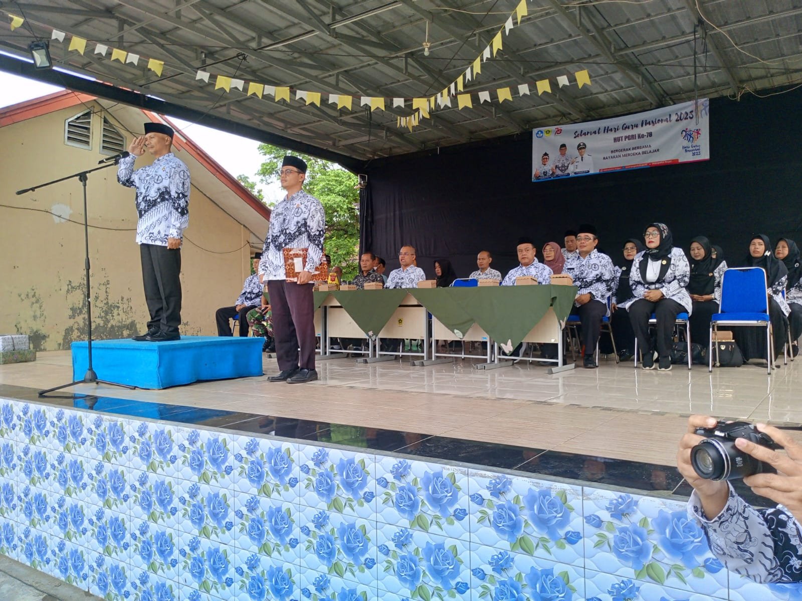 DRAMAGA, DINAMIKA NEWS — Camat Dramaga Kabupaten Bogor Atep Soleh Sumaryo, SH. MM memimpin Upacara Peringatan Hari Ulang Tahun (HUT) ke-78 Persatuan Guru Republik Indonesia (PGRI) dan Hari Guru Nasional (HGN) Tahun 2023, yang berlangsung di Lapangan Sekolah Menengah Pertama (SMP) Negeri 2 Dramaga Sabtu (25/11/2023).