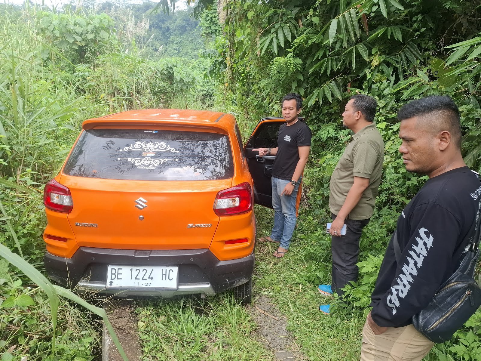 | Mobil Suzuki Spresso warna oranye dengan nomor polisi BE-1224-HC masuk ke area Agrowisata Lembah Cisadane. |
