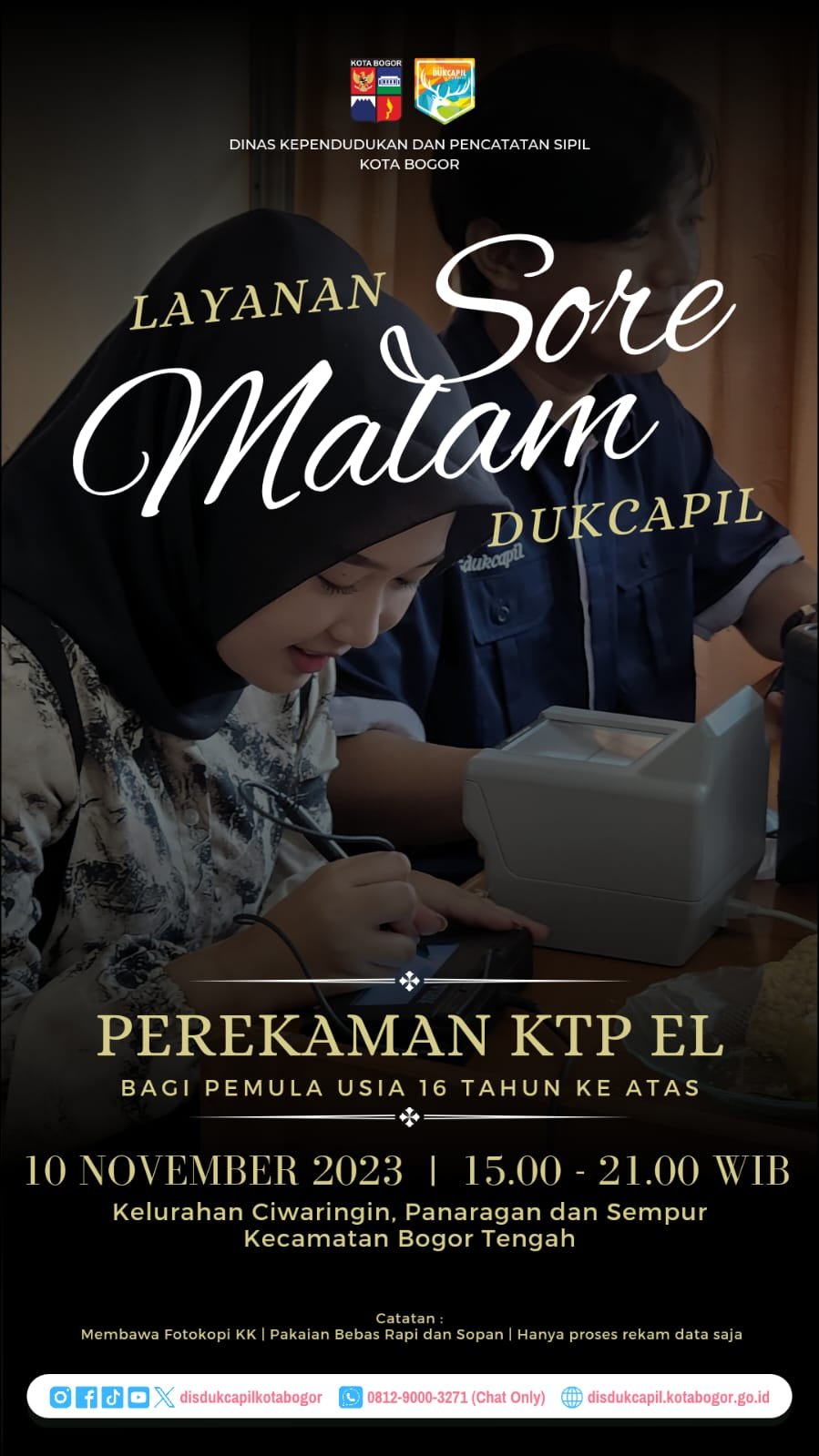 Layanan sore malam Dukcapil dilaksanakan di kantor kelurahan pada tanggal 10 November 2023. Petugas perekaman KTP El Disdukcapil bakal datang langsung di tiga kantor kelurahan di Kecamatan Bogor Tengah yaitu Kelurahan Ciwaringin, Kelurahan Panaragan dan Kelurahan Sempur.