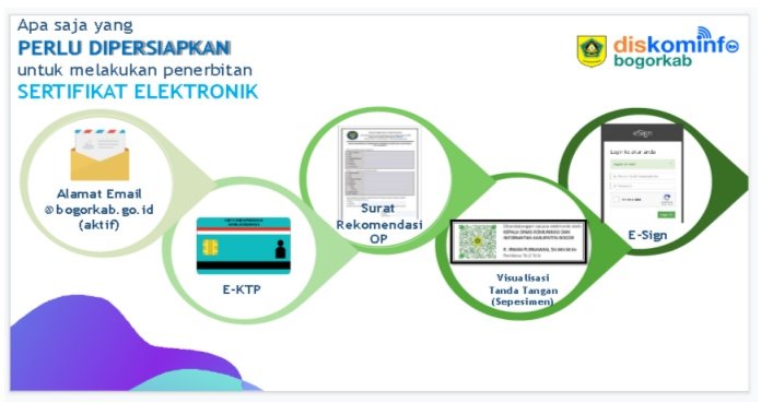 Bogor, pertama Peraturan Bupati Bogor Nomor 77 Tahun 2021 Tentang Tata Kelola Penggunaan Sertifikat Elektronik di Lingkungan Pemerintah Kabupaten Bogor. Kemudian Perjanjian Kerja Sama (PKS) Antara Diskominfo Pemerintah Kab. Bogor dengan BSrE dan SOP Penerbitan Tanda Tangan Eletronik.