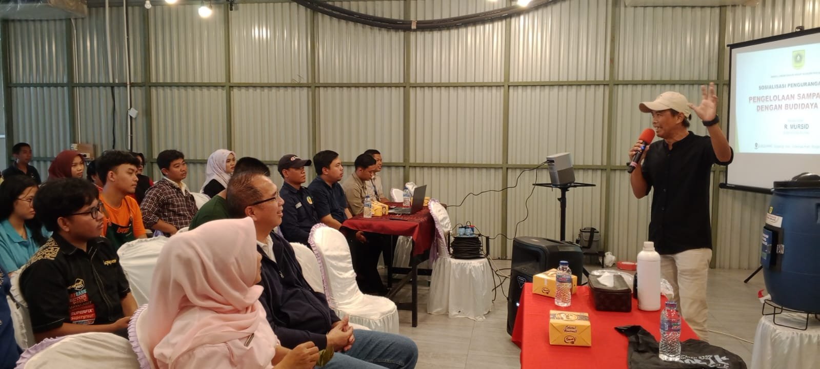 | R. Mursid dari KSM Mitra Ruhai Sukaraja memberikan pelatihan pengelolaan sampah dengan budidaya Manggot. |