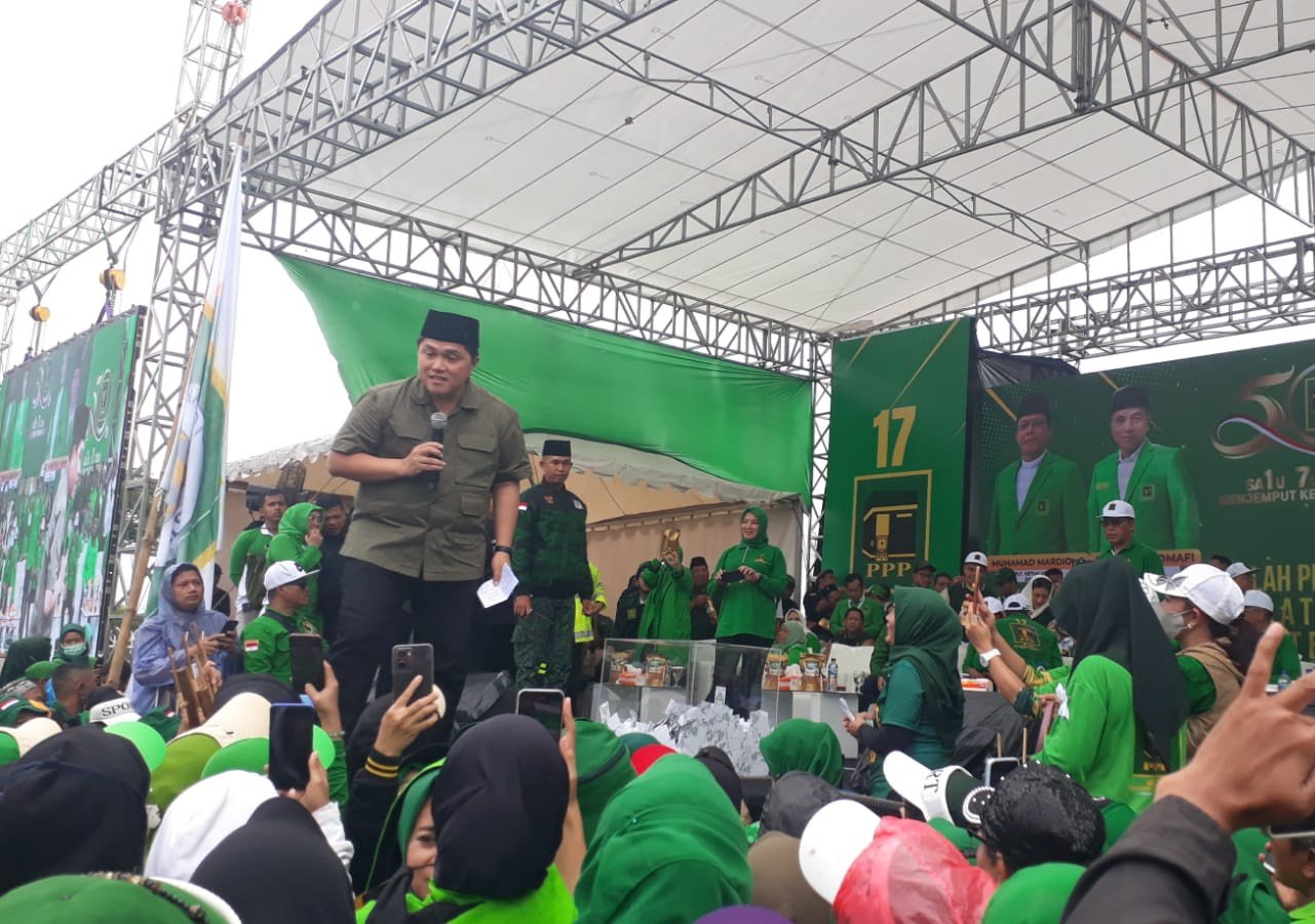 Cibinong, Dinamika News — Menteri BUMN, Erik Thohir menghadiri acara HUT ke-50 Partai Persatuan Pembangunan (PPP) di stadion Pakansari Cibinong Kabupaten Bogor, Minggu (12/2/2023). Kehadiran Erik Thohir menjadi berkah para pengusaha UMKM khususnya nasabah Bank Syariah untuk menambah modal usaha.