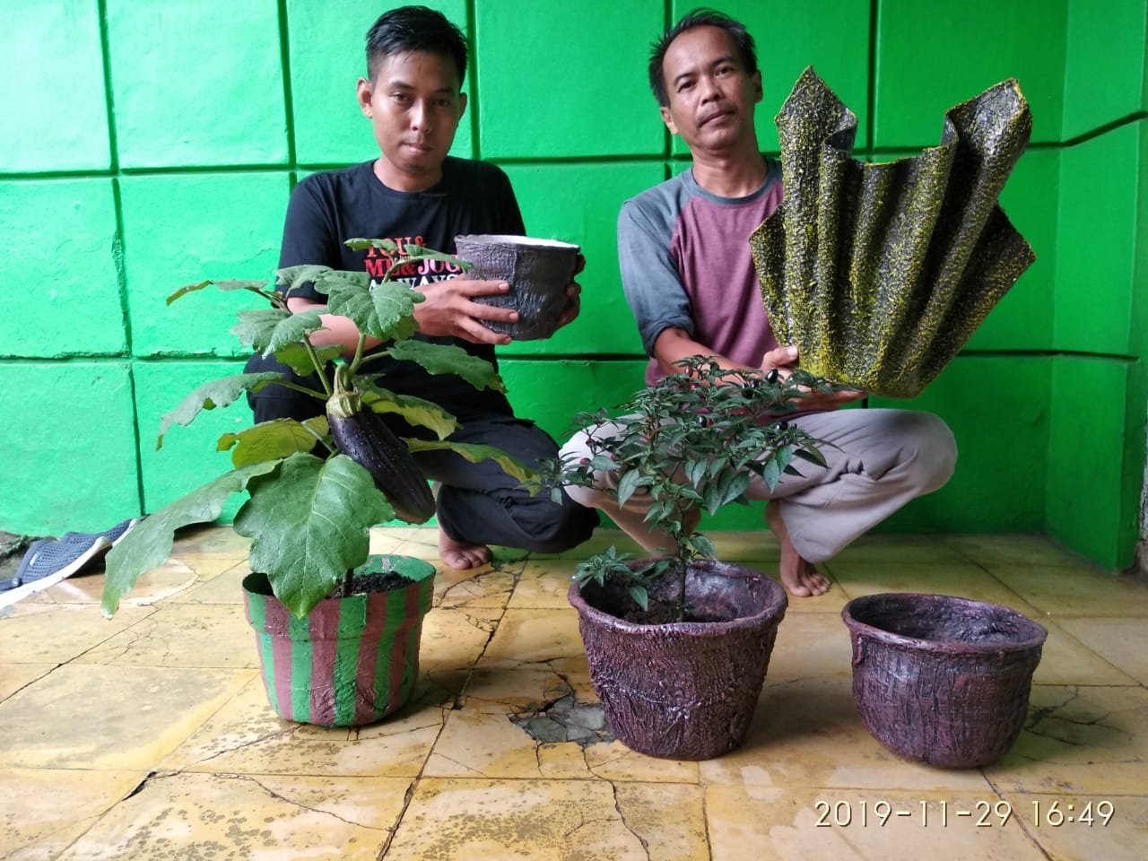 | Rd Mursid Ketua Devisi Kajian FPII Korwil Kota Bogor memperlihatkan pot dari bahan limbah. |