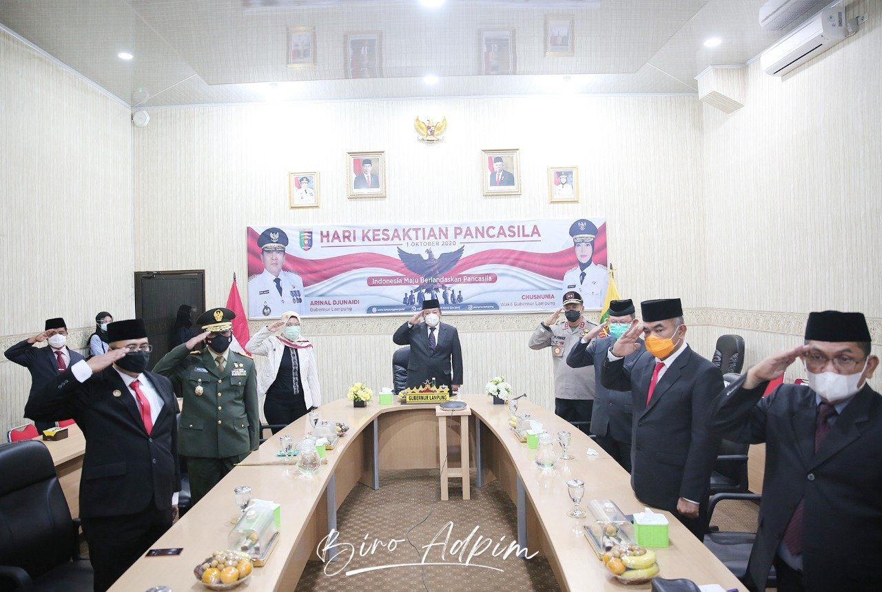 DinamikaNews, BANDAR LAMPUNG— Gubernur Lampung Arinal Djunaidi dan Wakil Gubernur Lampung Chusnunia Chalim (Nunik) serta Forkopimda Provinsi Lampung mengikuti Upacara Peringatan Hari Kesaktian Pancasila yang dipimpin langsung oleh Presiden Joko Widodo, melalui Virtual di Ruang Command Center, Dinas Kominfo Provinsi Lampung, Kamis (1/10/2020).