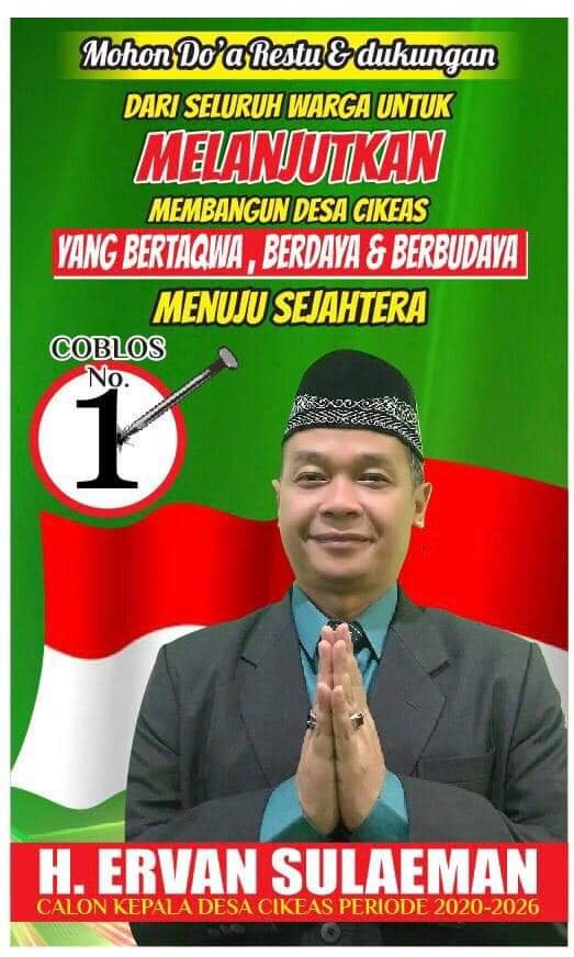 Calon kades petahana dua periode ini, maju kembali untuk melanjutkan dan menuntaskan pembangunan Desa Cikeas di periode ketiga. H. Ervan di pemilihan kepala desa serentak tahun ini, hanya mendapatkan satu kompetitor yaitu Rizki Saputra yang mendapatkan nomor urut 2.
