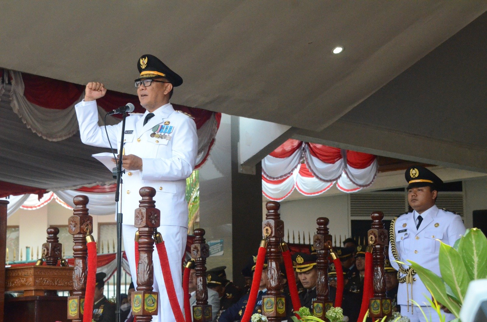 CIBINONG, DINAMIKA NEWS — Plt. Bupati Bogor, Iwan Setiawan mengajak seluruh komponen bangsa kuatkan tekad untuk terus melaju mewujudkan cita-cita Indonesia emas tahun 2045. Hal ini dikatakannya saat memimpin upacara peringatan Hari Ulang Tahun (HUT) ke-78 Proklamasi Kemerdekaan Republik Indonesia tahun 2023 tingkat Kabupaten Bogor, di Lapangan Tegar Beriman, Cibinong, Kamis (17/8).
