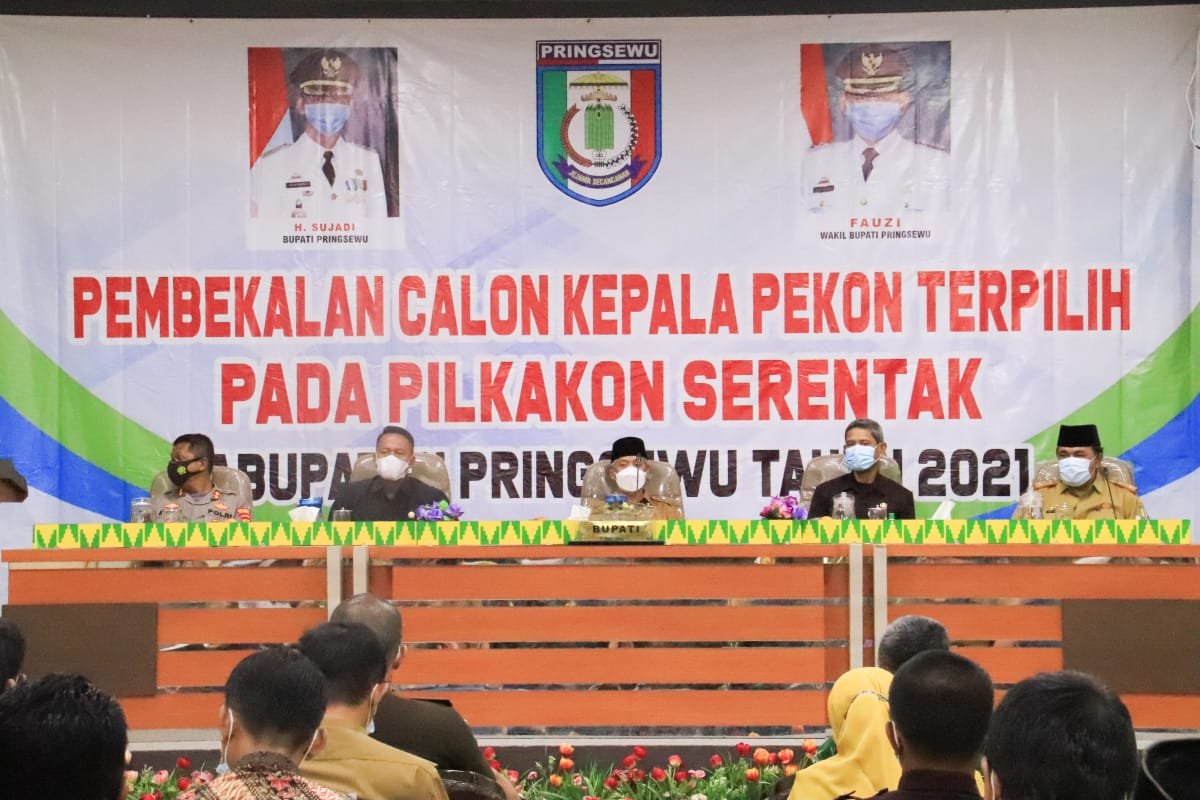 PRINGSEWU, DinamikaNews.id — 48 kepala pekon terpilih dari sembilan kecamatan hasil Pemilihan Kepala Pekon Serentak Kabupaten Pringsewu 2021 mengikuti pembekalan. Kegiatan dengan standar protokol kesehatan yang dibuka oleh Bupati Pringsewu di Aula Utama Pemkab Pringsewu, Senin (29 Maret 2021) ini antara lain dihadiri Ketua Komisi I DPRD Pringsewu Anton Subagyo, Sekretaris Kabupaten Pringsewu Heri Iswahyudi, Roni Abu Hasan dan Fatkurozi dari Balai Pemerintahan Desa Kemendagri RI Wilayah Sumatera serta jajaran forkopimda Pringsewu.