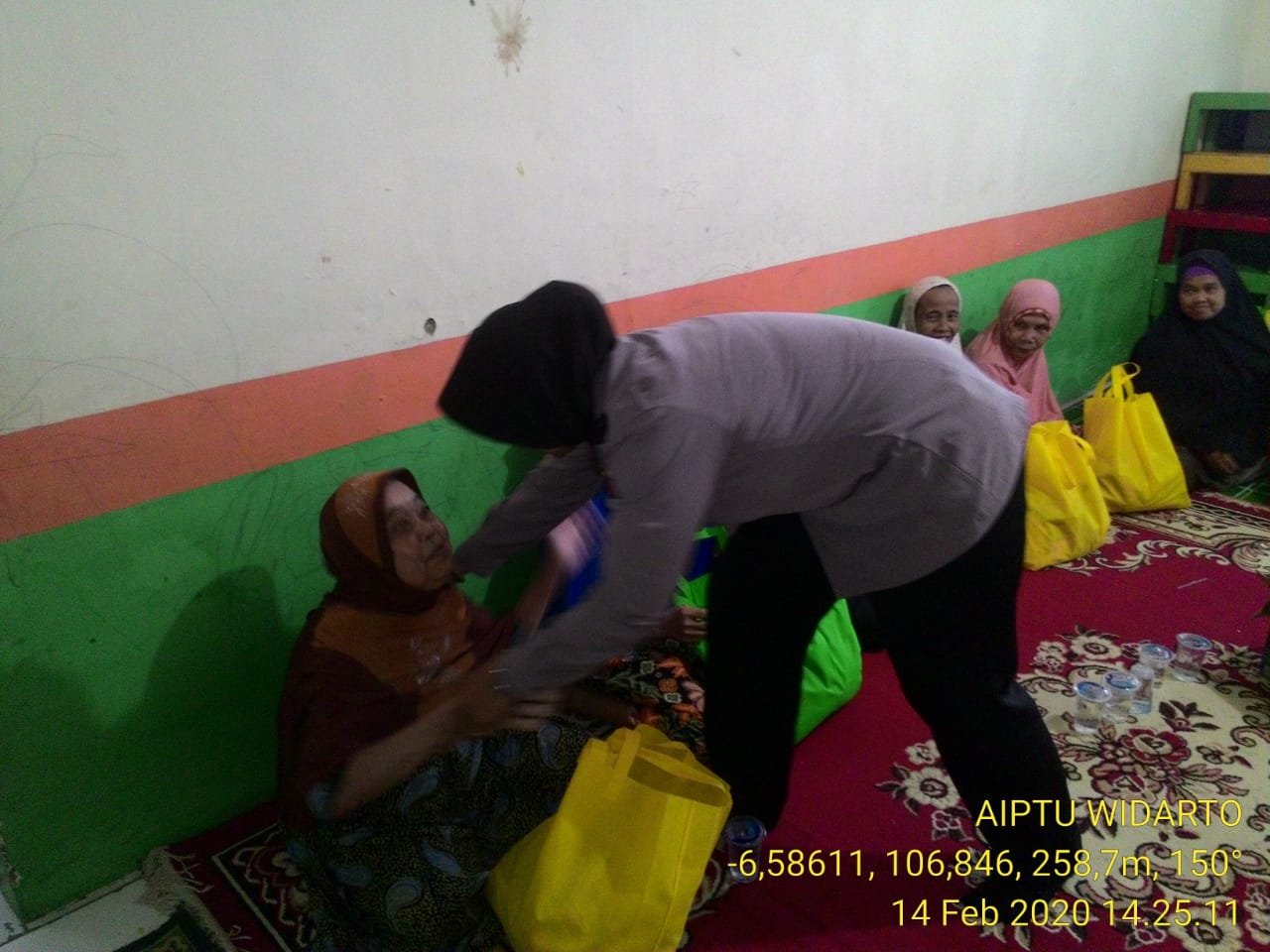 | Kapolsek Sukaraja Kompol Ari Trisnawati menyapa dan menyantuni para janda dan jompo di Ponpes Nurul Qur’an Desa Cikeas. |