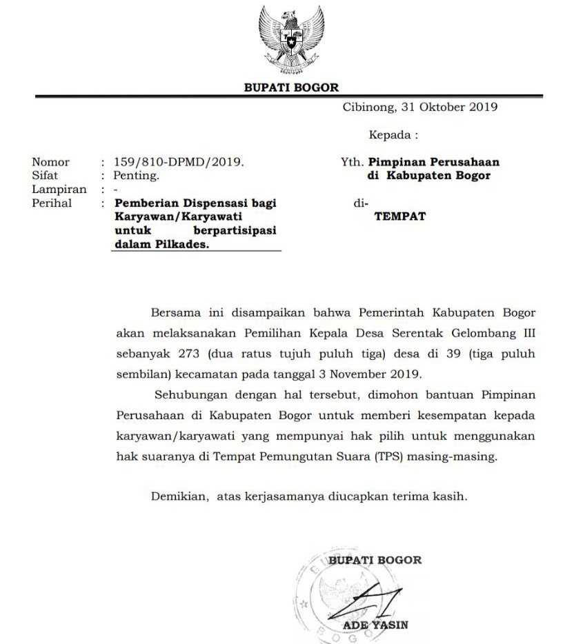 "Kami minta pimpinan perusahaan beri izin karyawannya ikut Pilkades", kata Ade Yasin disampaikan tertulis, Jumat (1/11/2019) sore.