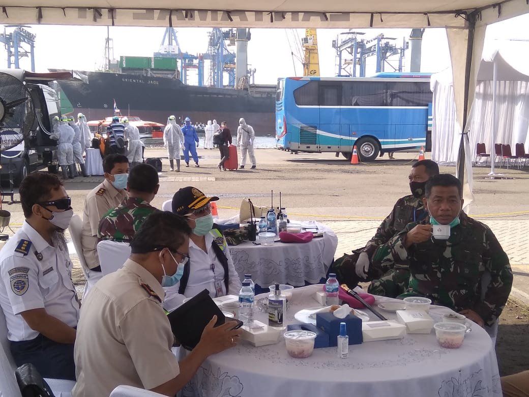 Sesampainya didermaga Tim satgas langsung melakukan penyemprotan disinfektan baik terhadap tubuh maupun barang bawaannya, terkhusus untuk barang bawaan diwajibkan melewati X-Ray dari Tim Bea Cukai dan juga pemeriksaan oleh K-9/Anjing Pelacak Pom Lantamal III Jakarta.