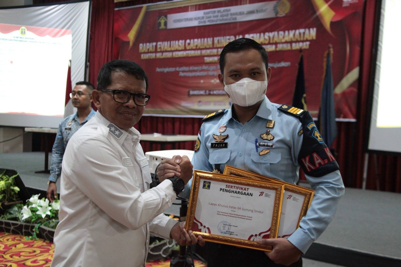 Bandung, Dinamika News — Lembaga Permasyarakatan (Lapas) Khusus Kelas IIA Gunung Sindur menerima tiga piagam penghargaan sekaligus pada Penutupan Kegiatan Rapat Evaluasi Capaian Kinerja Pemasyarakatan yang digelar Kanwil Kemenkumham Jabar di Hotel Savoy Homan Bandung, Jumat, 4 November 2022.