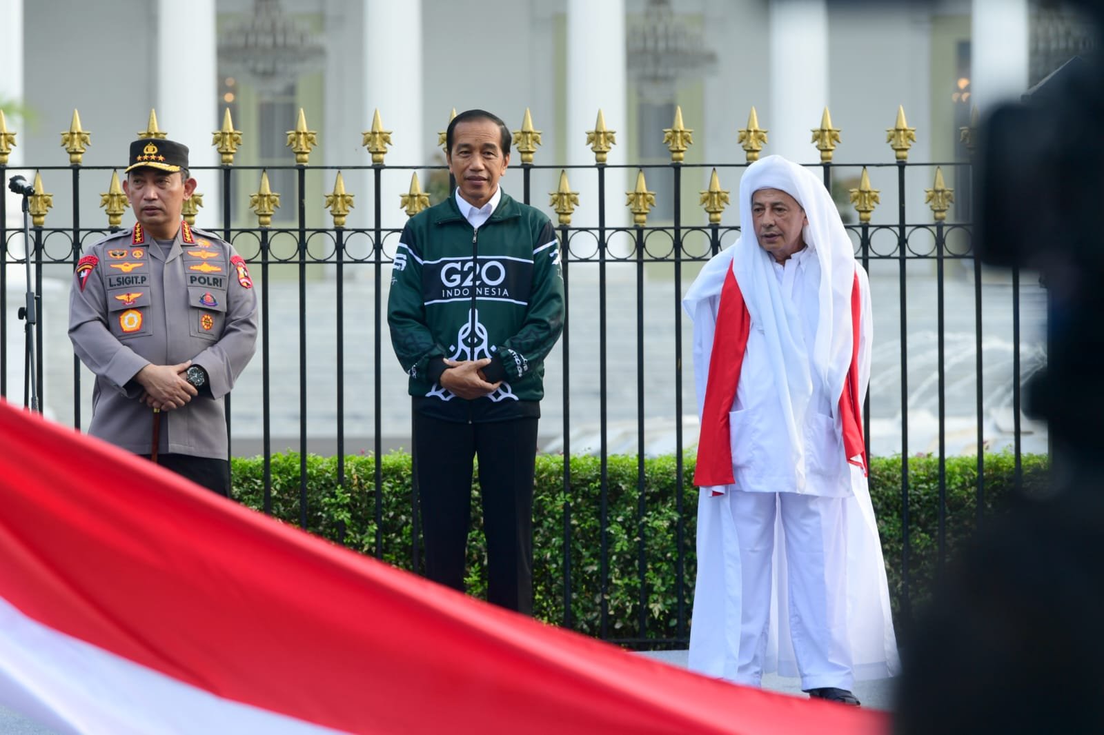 “Bersama-sama dengan Kapolri, bersama-sama dengan Habib Luthfi bin Yahya, dengan mengucap bismilillahirahmanirahim, pagi hari ini saya nyatakan Kirab Merah Putih diberangkatkan,” ucap Presiden.