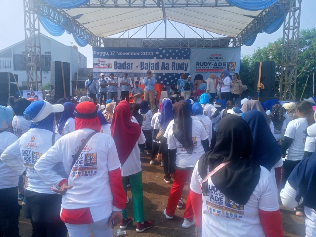 Bogor, DINAMIKA NEWS — Massa pendukung Calon Bupati (Cabup) Bogor Rudy Susmanto memadati lapangan Ciomas Harapan mengikuti senam sehat, pemberdayaan perempuan dan Usaha Mikro Kecil dan Menengah (UMKM) yang digelar BADAR (Balad Aa Rudy), Minggu (17/11/2024) pagi.