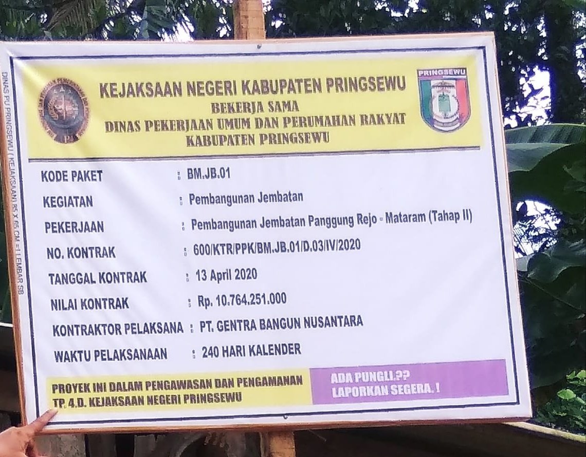 Hasil dari Penulusuran tim media ini beberapa waktu lalu ditemukannya pemasangan plank proyek milik Dinas PUPR Pringsewu dengan menerangkan bahwa kegiatan proyek pembangunan jembatan Panggungrejo – Mataram (Tahap II) senilai 10 milyar tersebut masuk dalam pengawasan dan pengamanan TP4D Kejaksaan Negeri Pringsewu.
