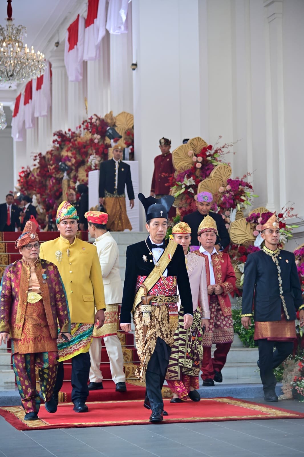 JAKARTA, DINAMIKA NEWS — Presiden Joko Widodo tampil mengenakan pakaian adat ageman songkok singkepan ageng pada Upacara Peringatan Detik-Detik Proklamasi dalam rangka Hari Ulang Tahun Ke-78 Republik Indonesia pada Kamis, 17 Agustus 2023. Pakaian tersebut merupakan pakaian khas Keraton Kesunanan Surakarta.