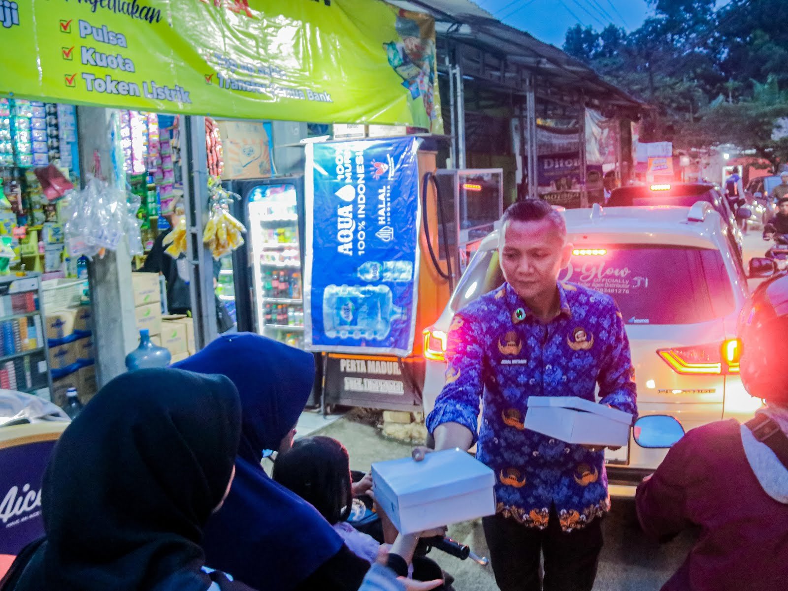 | Wakil Wali Kota Bogor, Jenal Mutaqin, memberikan nasi boks kepada para pengendara dan warga di sekitar jalur alternatif BNR – Cipinang Gading. |
