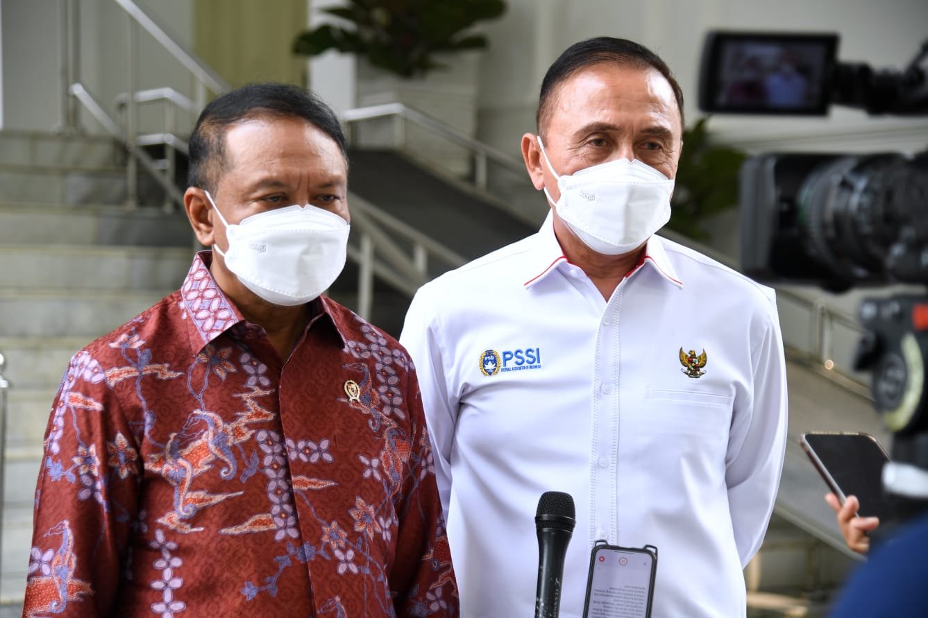 | Menpora Zainudin Amali dan Ketua Umum PSSI Mochamad Iriawan saat memberikan keterangan pers di Istana Merdeka, Jakarta, Rabu, 3 Agustus 2022. |
