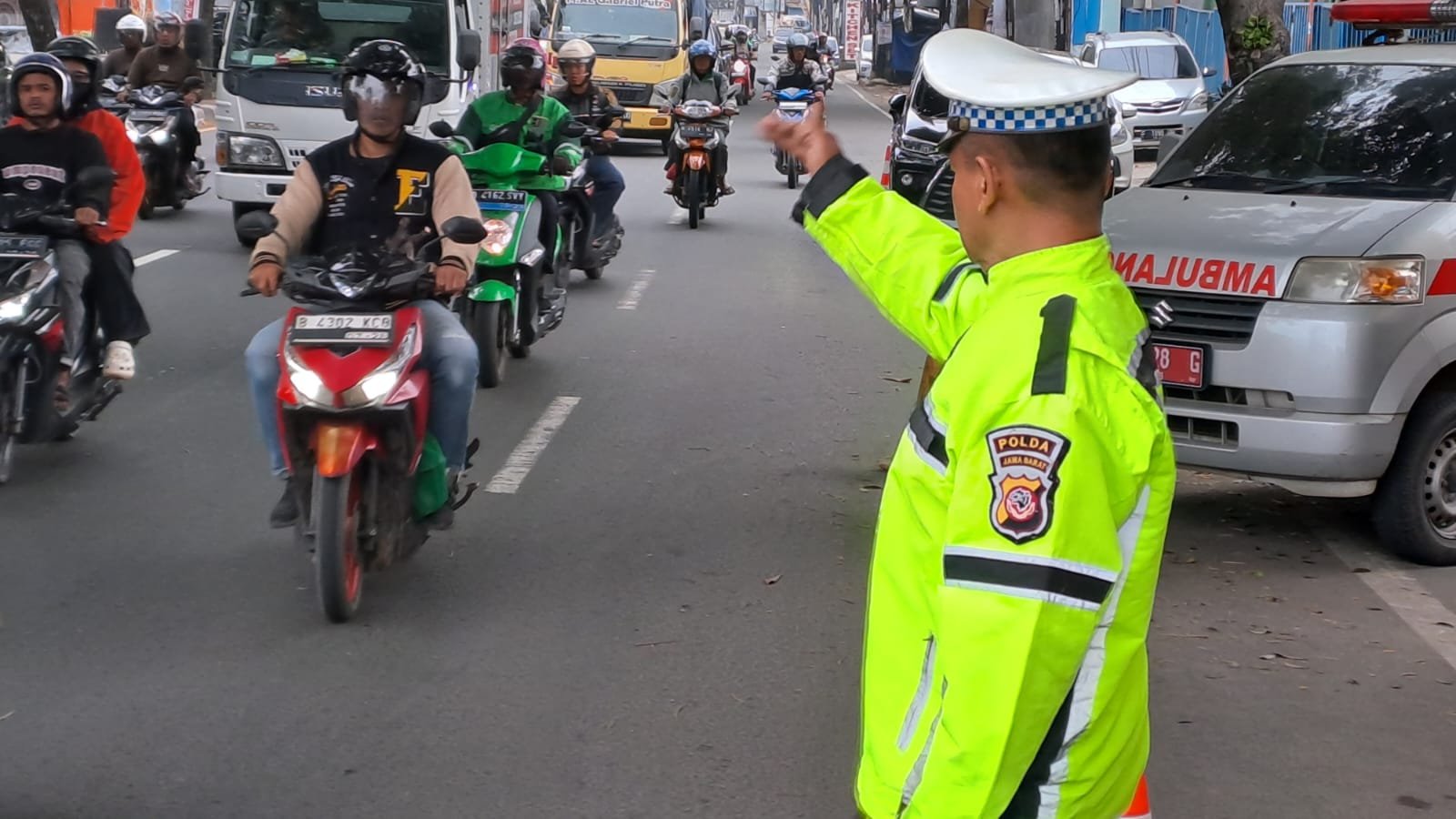 Personil pos pam Gunung Putri sedang mengatur arus lalulintas.