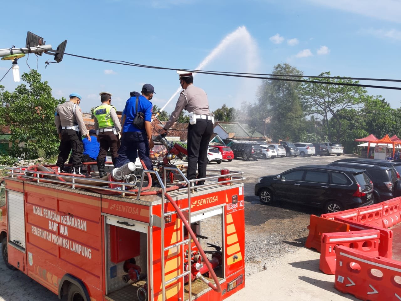 Petugas Gabungan Pringsewu Turunkan Dua Unit Damkar Semprot Cairan Disinfektan