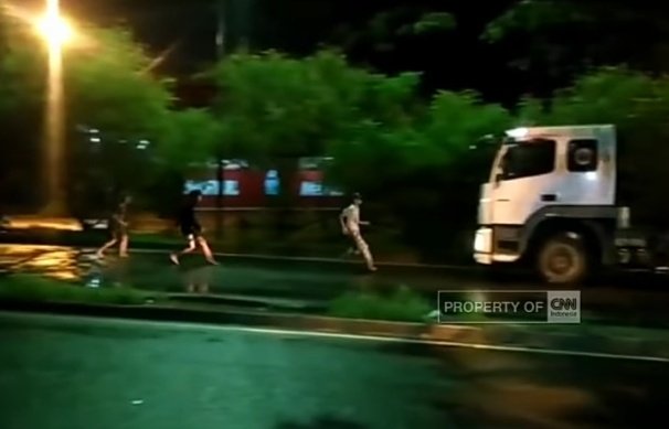 Video itu merekam remaja menghentikan truk tronton yang tengah melaju. Remaja berbaju putih menyeberang jalan berniat menghentikan truk dan bergabung dengan temannya.