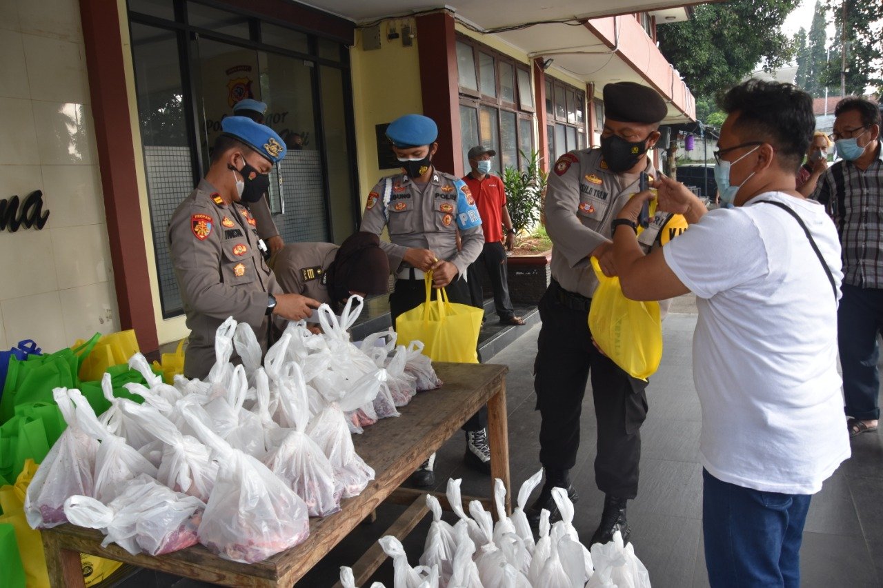 Bogor, Dinamika News — Polres Bogor bagikan daging hewan kurban di hari Raya Idul Adha 1442 H. Selain daging kurban bagi masyarakat dan wartawan yang terdampak pemberlakuan PPKM Jawa-Bali.
