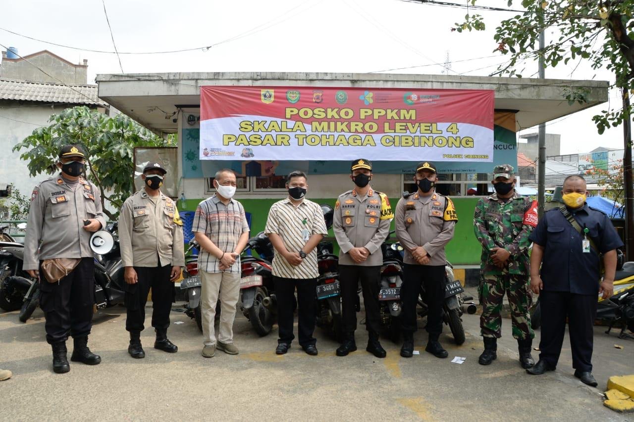 Cibinong, Dinamika News – Kapolres Bogor AKBP Harun, didampingi Kabag Ops Polres Bogor Kompol Fitra Zuanda, Kasat Binmas Polres Bogor AKP Achmad Budisantoso dan Kapolsek Cibinong AKP Bayu Tri Nugraha Hidayat, melakukan kunjungan PPKM Mikro Level 4 di Pasar Tohaga Cibinong, pada Sabtu (31/07/2021).