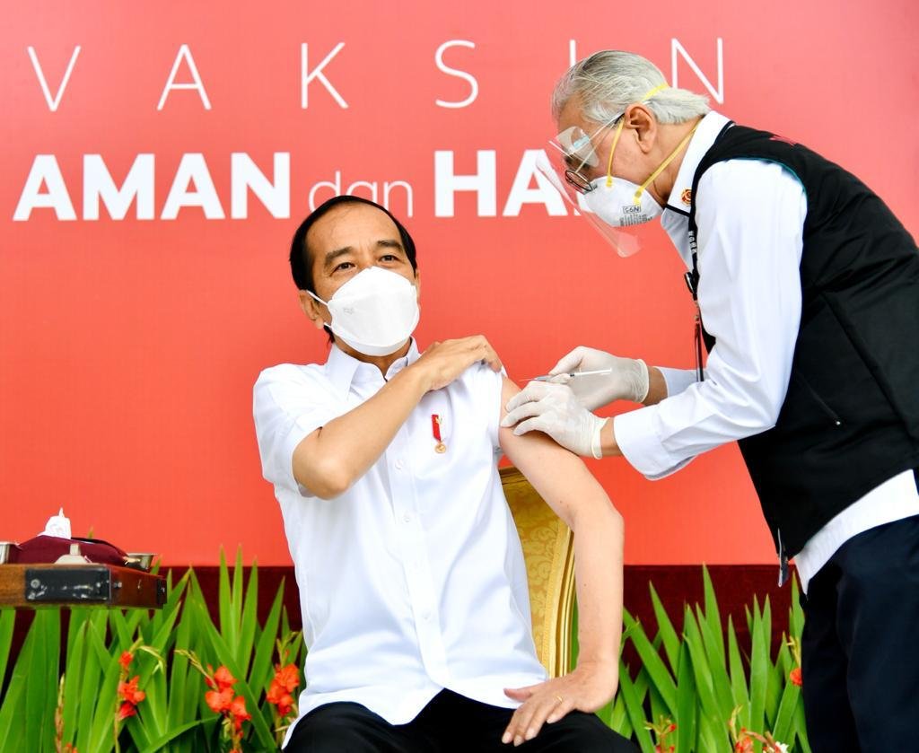 Jakarta, Dinamika News — Presiden Joko Widodo pada hari ini, Rabu, 13 Januari 2021, di Istana Merdeka, Jakarta, menjadi orang pertama yang menerima vaksin dalam program vaksinasi massal secara gratis di Indonesia. Vaksinasi tersebut menjadi titik awal pelaksanaan vaksinasi nasional di Indonesia sebagai salah satu upaya penanganan pandemi Covid-19.