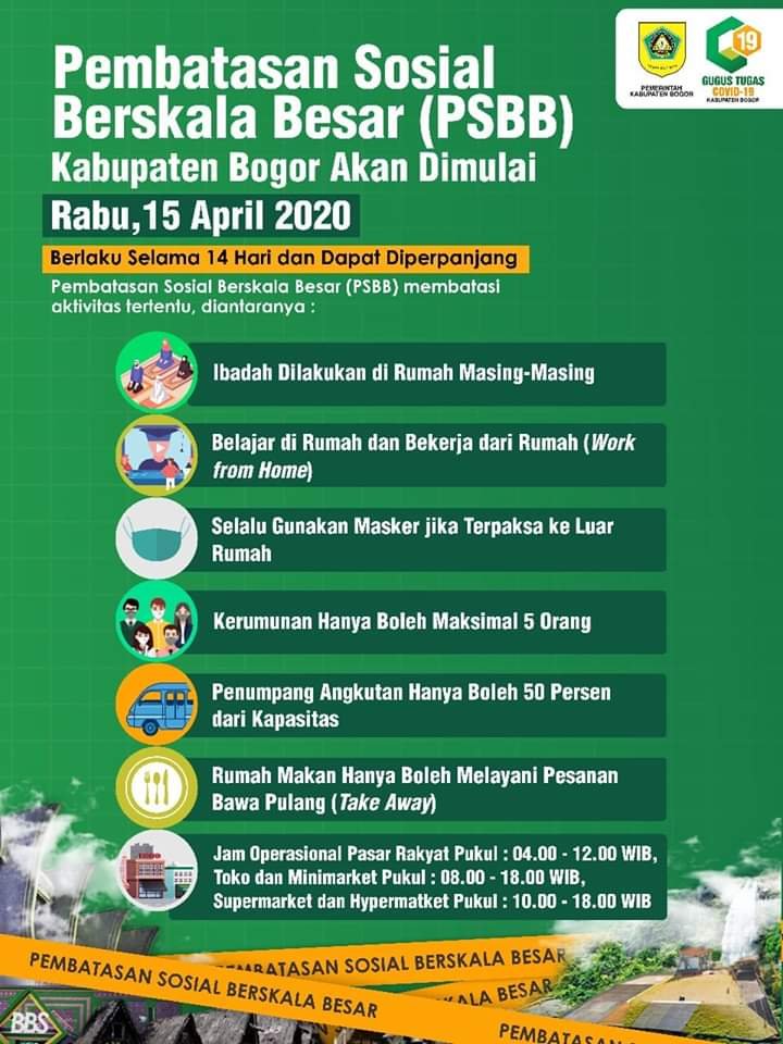 Dinamika News, Bogor — Pembatasan Sosial Berskala Besar (PSBB) akan dilaksanakan mulai Rabu, 15 April 2020 dan akan diprioritaskan di daerah-daerah Zona Merah sesuai data Gugus Tugas COVID-19 Kabupaten Bogor.