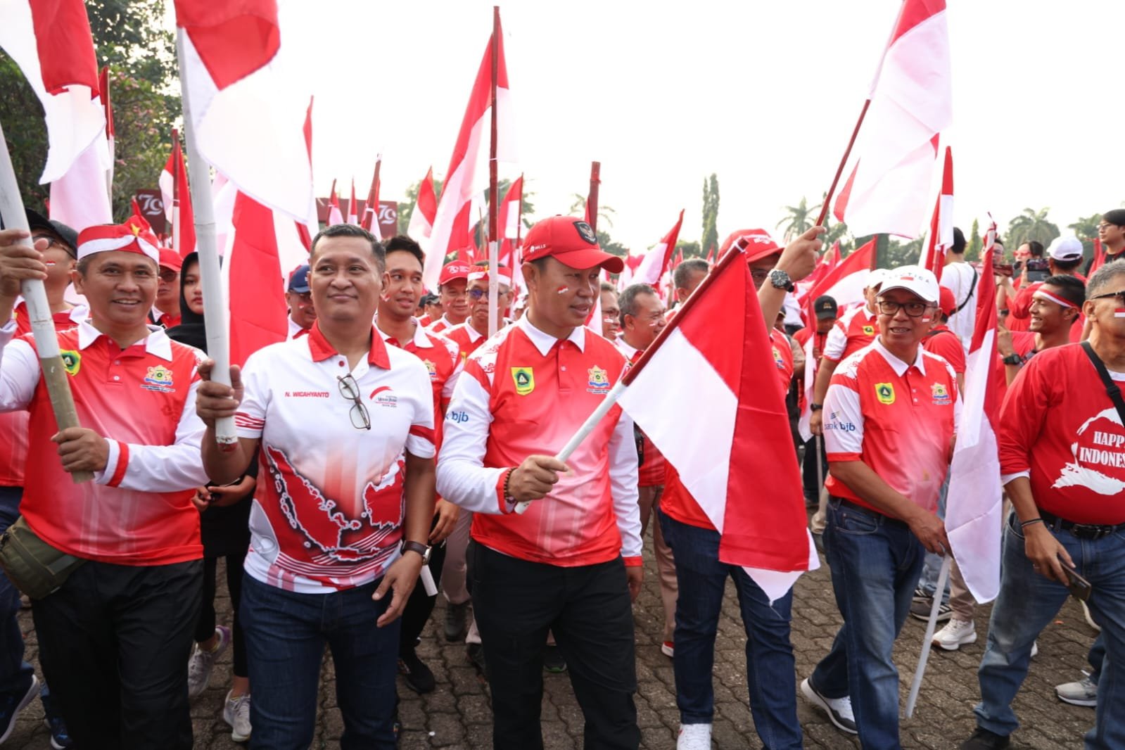 CIBINONG, DINAMIKA NEWS — Pj. Bupati Bogor Asmawa Tosepu memimpin langsung kirab merah putih dari Lapangan Tegar Beriman finish di Stadion Pakansari. Kirab bendera merah putih diikuti ribuan peserta mulai dair Aparatur Sipil Negara (ASN) dan masyarakat Kabupaten Bogor, Minggu (11/8/24).