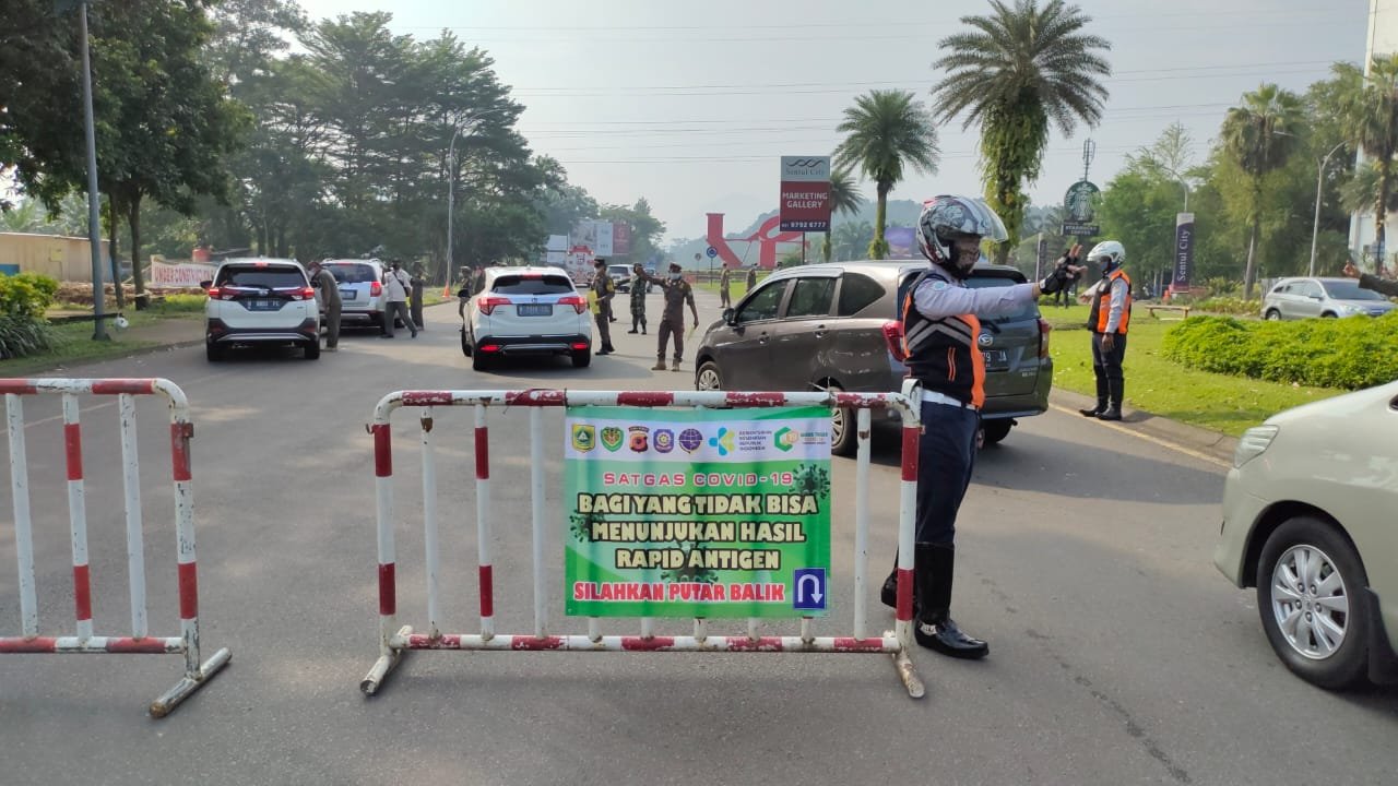 Bogor, DinamikaNews.id – Sedikitnya 2.115 kendaraan menuju kawasan Puncak Bogor diputar arah. Para pengendara mencoba memanfaat jalan alternatif Babakan Madang, hingga terjadi penumpukan di Jalan MH Thamrin Sentul City, Kecamatan Babakan Madang, Kabupaten Bogor, Sabtu (15/5/2021).