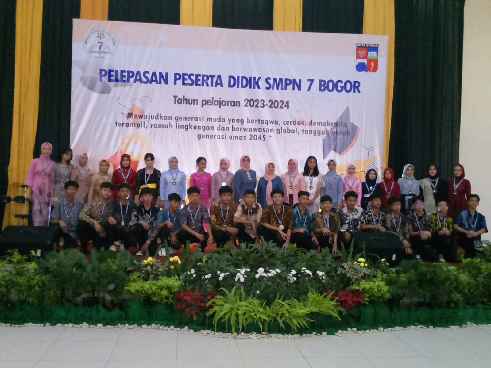 Hubungan Masyarakat (Humas) SMP Negeri 7 Kota Bogor Dewi Rahmawati mengatakan, SMP Negeri 7 Kota Bogor tahun ini meluluskan 318 peserta didik Kelas IX tahun pelajaran 2023-2024, dengan mengusung tema, ‘Mewujudkan Prestasi Muda Yang Bertaqwa, Cerdas, Demokratis, Terampil, Ramah Lingkungan Dan Berwawasan Global, Tangguh Untuk Generasi Emas 2045’.