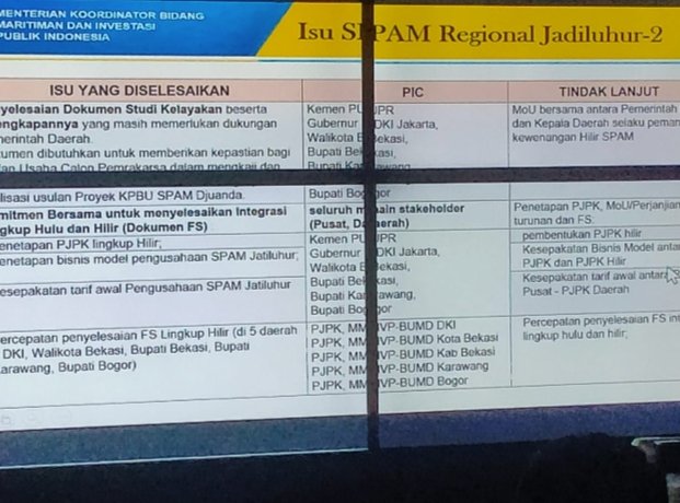Dalam paparannya kepada Menko Maritim Wakil Bupati Bogor Iwan setiawan juga meminta agar penentuan tarif yang dijual ke PDAM Tirta Kahuripan bisa lebih rendah dibawah harga yang biasa dijual ke masyarakat di Kabupaten Bogor agar Perumda PDAM Tirta Kahuripan bisa memiliki margin atau minimal tidak ada pengeluaran untuk mengaliri air ke wilayah Bogor timur.