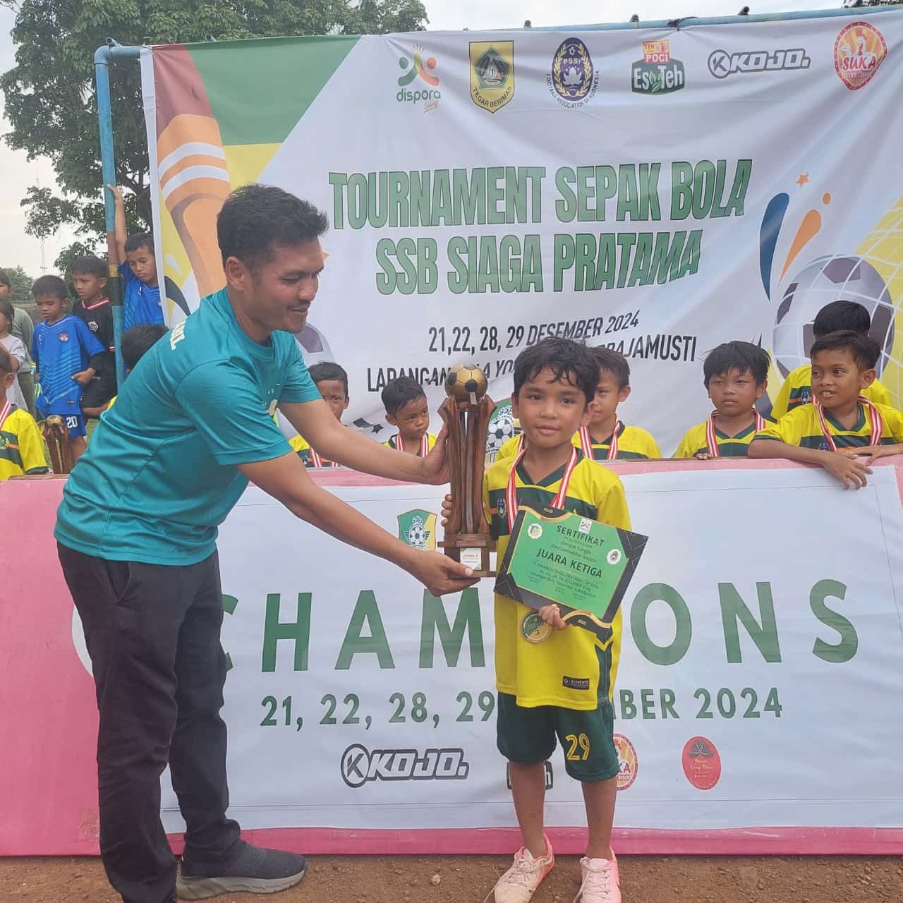 Bogor, DINAMIKA NEWS — Tim Sekolah sepak bola (SSB) Kabo Mania juara 3 turnamen Piala Siaga Pratama 2024 Kelompok Umur U8 (KU) 2016. Turnamen yang berlangsung satu hari penuh diikuti 12 club SSB di wilayah Kota dan Kabupaten Bogor di lapangan Yon Armed 10 Cibinong, Kabupaten Bogor, Sabtu 21 Desember 2024