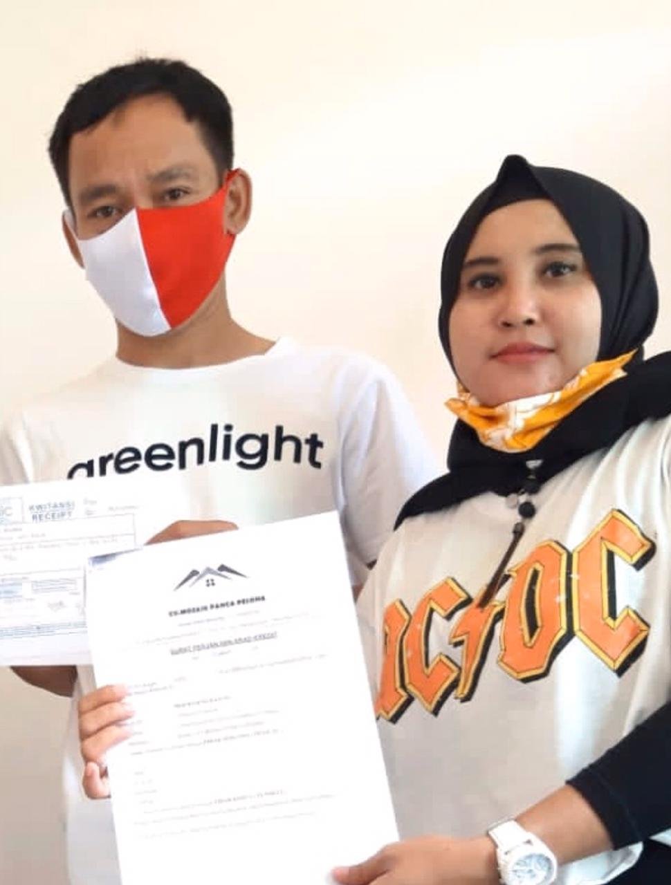| Budiarto dan istri menunjukkan bukti pembayaran pemesanan kavling rumah |