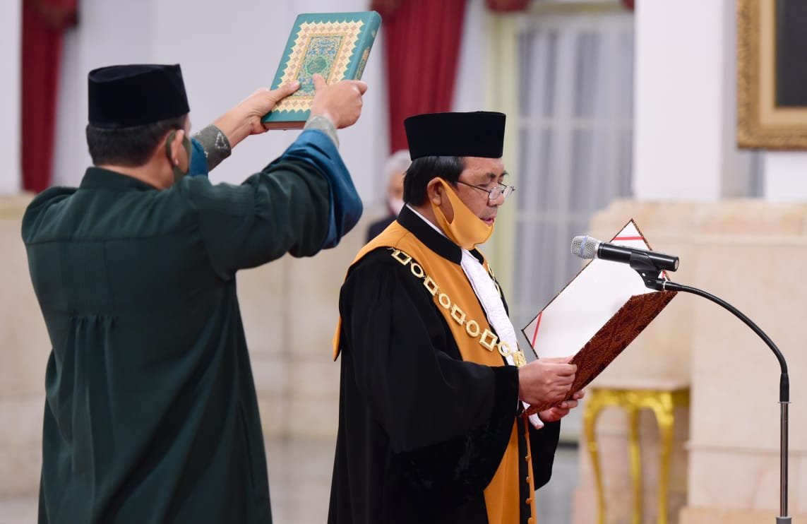 Dinamika News, Jakarta — Presiden Joko Widodo pada Kamis, 30 April 2020, mengambil sumpah Muhammad Syarifuddin sebagai Ketua Mahkamah Agung (MA). Pengambilan sumpah dengan menerapkan protokol kesehatan secara ketat tersebut digelar di Istana Negara, Jakarta.