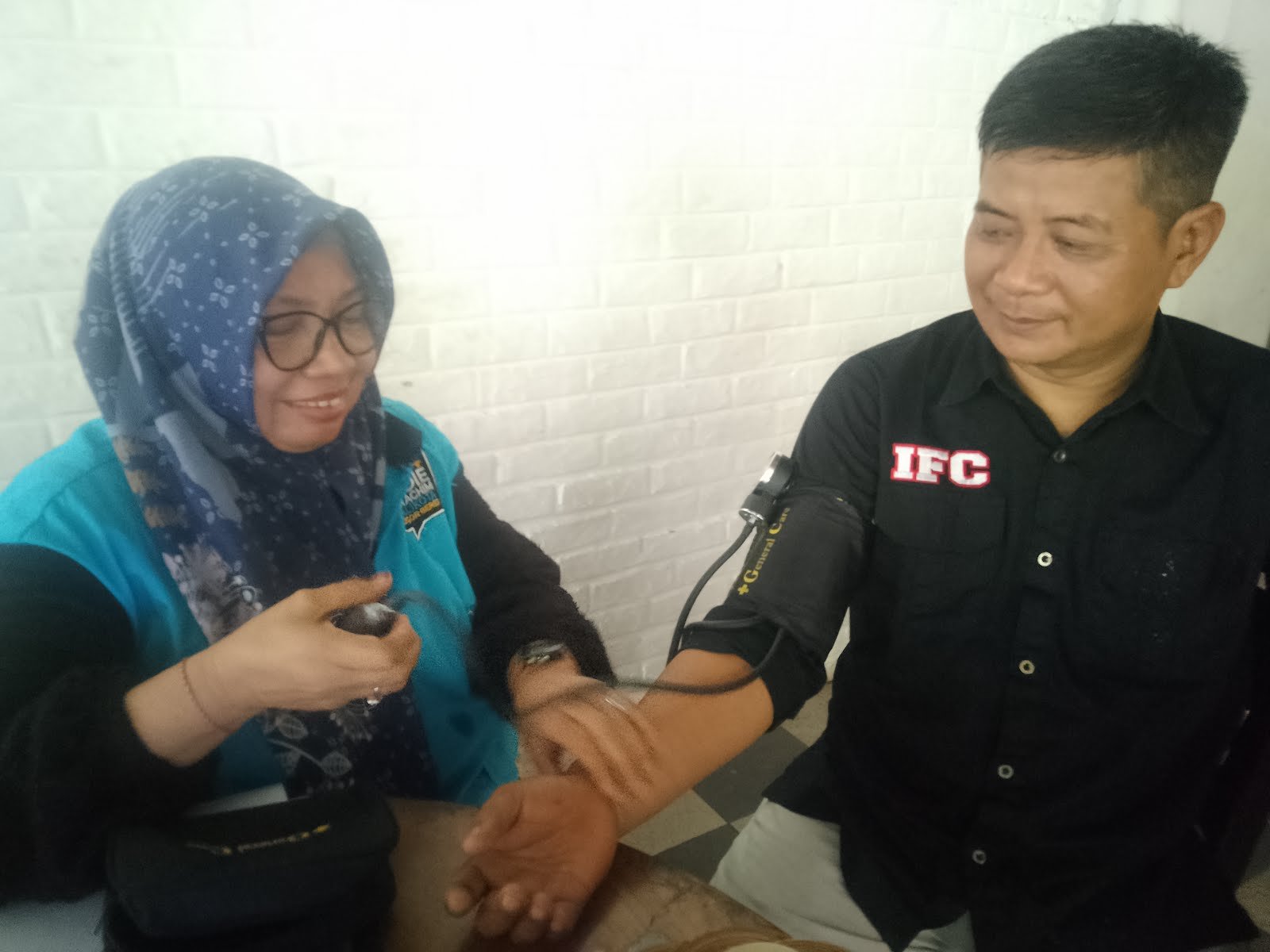 | Ketua Umum Relawan One Kes AMKB, Kartika Sari sedang melakukan tensi darah kepada tim sukses calon walikota Bogor Dedie A Rachim di Posko Ceremai. |