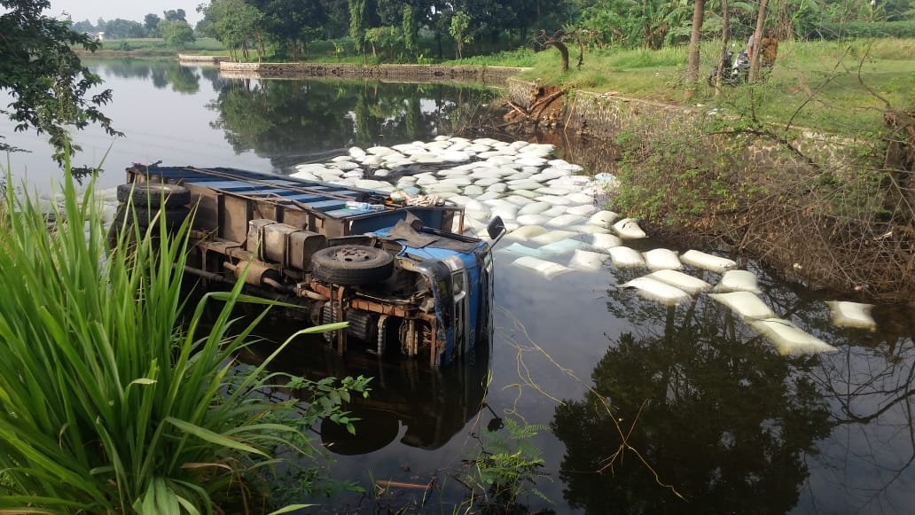 Sementara itu, Udin saksi di tempat kejadian mengatakan, Arah berlawanan mobil pengangkut ayam mau belok ke arah kanan terjebak macet dan mobil truk pembawa sekam tersebut ngebuang ke arah kiri ngebanting dan pada akhirnya terperosok ke setu, pungkasnya. (man)