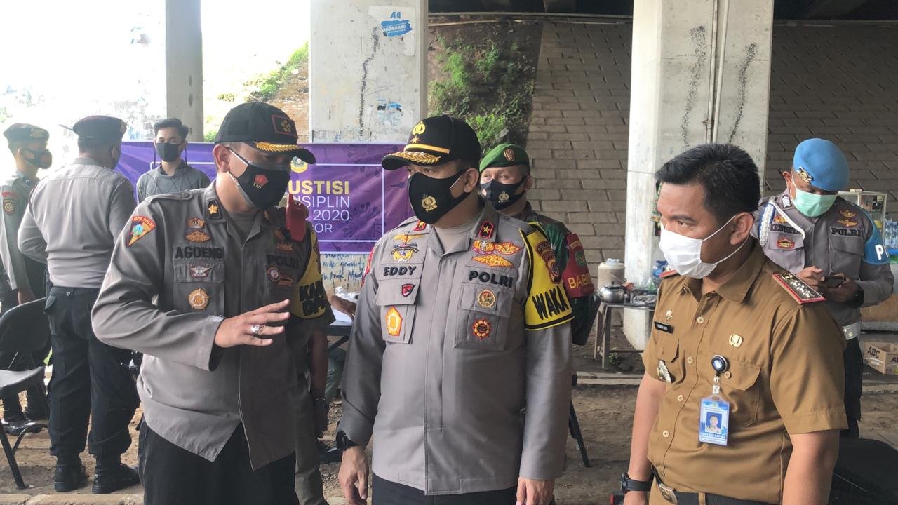 DinamikaNews, Bogor – Polres Bogor-Setelah 2 pekan berlalu selama penerapan masa PSBB pra AKB ke-3 yang dilakukan oleh Pemerintah Kabupaten Bogor. Wakapolda Jabar Brigjen Pol. Drs. Eddy Sumitro Tambunan, M,Si kembali tinjau lokasi pelaksanaan Operasi Yustisi pada masa perpanjangan PSBB Pra AKB Kabupaten Bogor di Citeureup, Rabu (30/09/2020).